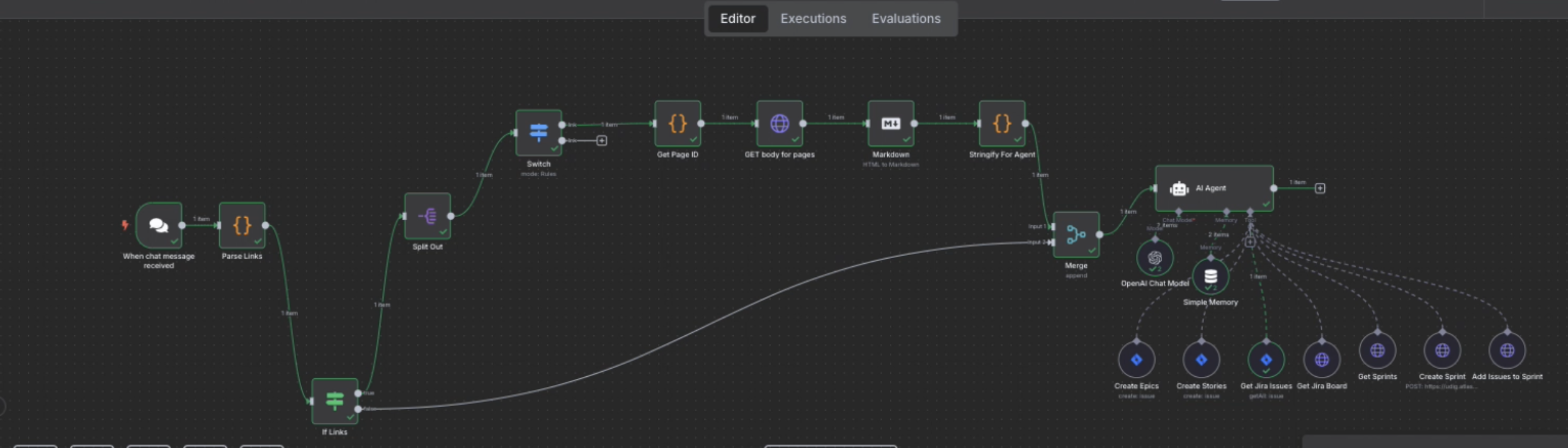 This specific workflow utilized a chat input from the user to trigger the workflow including the URL to the Confluence page. This then triggered a subflow utilizing the Confluence API to read the contents of the page, format it appropriately, and send the information to the n8n AI Agent. After the AI Agent received that information, it was prompted to generate user stories and groupings of features, called epics. This is then displayed to the user within the chat window of n8n.