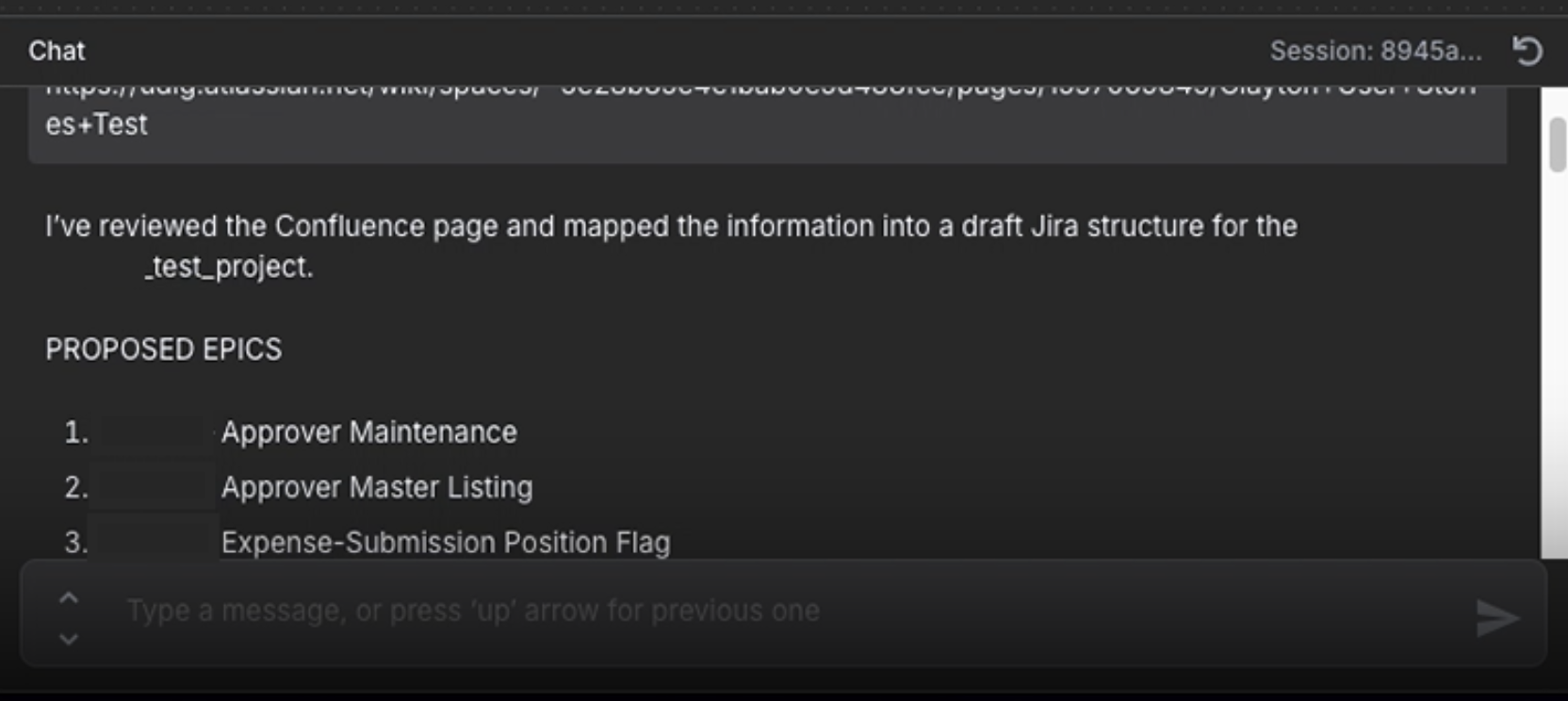 Once the output is created from the AI Agent and confirmed by a user, the user can then prompt the AI Agent to create the user stories and epics within Jira. The n8n AI Agent can autonomously invoke a function, script, or API call based on the need. For this use case, the n8n Agent made a call to the Jira API to create the new Stories and Epics within the identified Jira instance.