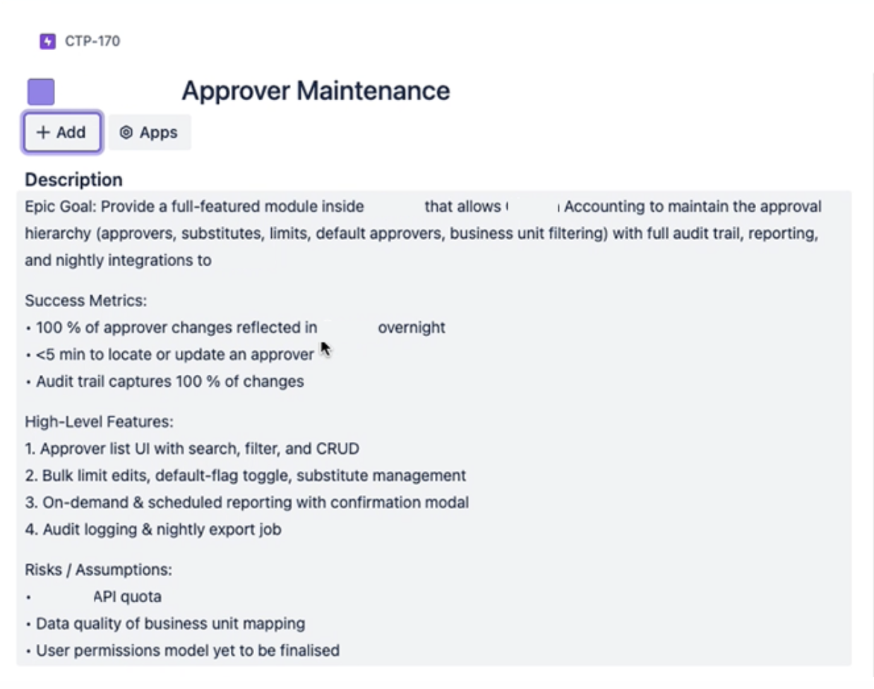 - Consistency – Instead of multiple resources writing user stories, estimating, etc., there is one source providing that information, leading to more consistency.