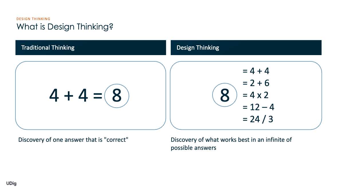 Great problem-solving comes from examining multiple angles, doing extra brainstorming, and not settling for the first idea. Asking, “Are there other options here?” Can we fundamentally change outcomes, not just for designers, but for anyone working through complex problems? Below is a visual I really like about design thinking:
