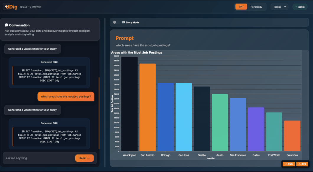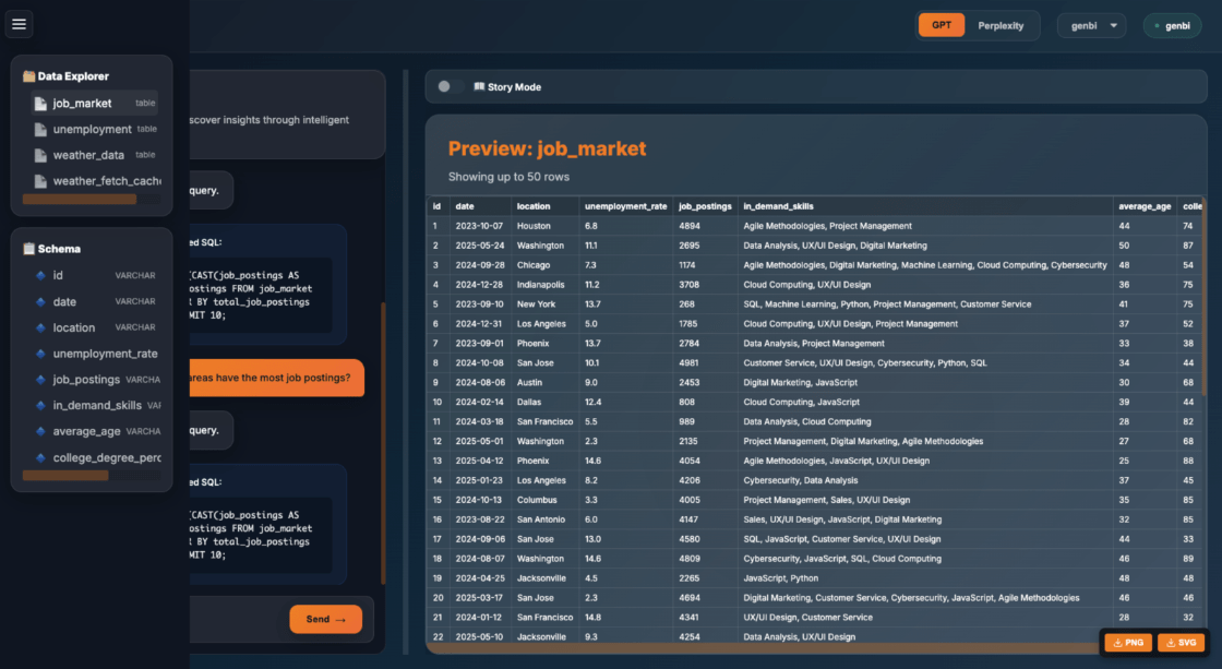 We designed the GenBI frontend to be fast, clean, and intuitive. Built using React/Next.js and Tailwind, the UI uses a two-panel layout that pairs a conversational interface on the left with visualizations and data previews on the right. This allows users to interact naturally while immediately seeing the results of their questions.