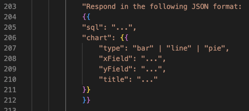 The success of GenBI hinges on thoughtful prompt engineering. The prompts tell the model how to behave, what format to use, what guardrails to follow, and how to remain grounded in the schema. We required the LLM to return a JSON object containing SQL, the Vega-Lite spec to force a deterministic contract between the model and the frontend.
