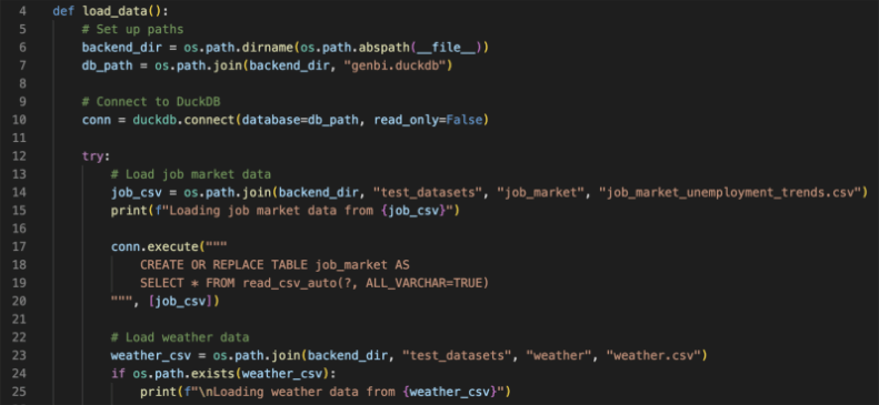 The backend uses DuckDB as its analytical engine, chosen for its simple configuration and zero infrastructure footprint. DuckDB allowed us to run SQL queries directly against local datasets at high speed, which kept the feedback loop tight for experimentation.